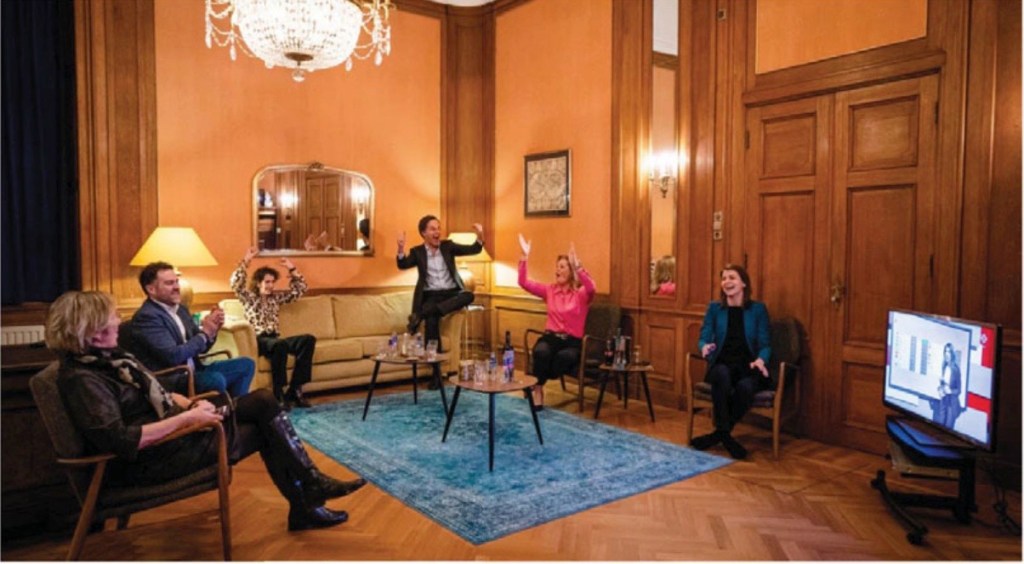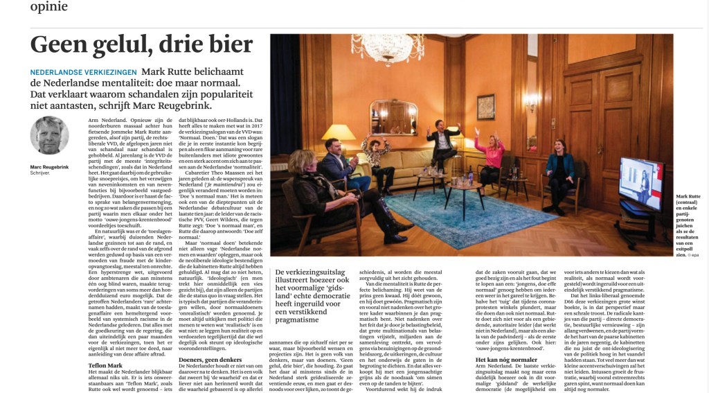Van die mentaliteit is Rutte de perfecte belichaming. Hij weet van de prins geen kwaad. Hij dóét gewoon, en hij doet gewóón. Pragmatisch zijn en vooral niet nadenken over het grotere kader waarbinnen je dan pragmatisch bent. Niet nadenken over het feit dat je door je belastingbeleid, dat grote multinationals van belastingen vrijstelt, miljarden aan de samenleving onttrekt, om vervolgens via bezuinigingen op de gezondheidszorg, de uitkeringen, de cultuur en het onderwijs de gaten in de begroting te dichten. En dit alles wordt dan met een jongensachtige grijns verkocht als de noodzaak ‘om sámen even op de tanden te bijten’. Voortdurend de indruk wekken dat de zaken vooruit gaan, dat we goed bezig zijn en als het fout begint te lopen aan een: ‘jongens, doe effe normaal’ genoeg hebben om iedereen weer in het gareel te krijgen, behalve het ‘tuig’ dat tijdens coronaprotesten winkels plundert. Maar dat doet dan ook niet normaal. Rutte doet zich bij dat alles niet voor als een gebiedende, autoritaire leider (dat werkt niet in Nederland), maar als een akela van de padvinderij — als de eerste onder zijns gelijken. Ook hier: ‘ouwe-jongens-krentenbrood’.