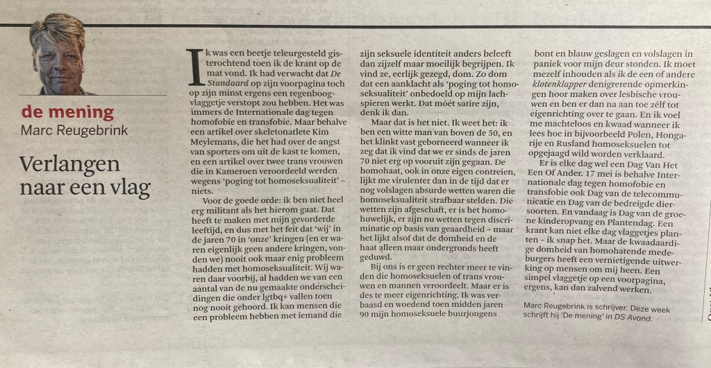 Er is elke dag wel een Dag Van Het Een Of Ander. 17 mei is behalve Internationale Dag tegen homofobie en transfobie, ook Dag van de telecommunicatie en Dag van de bedreigde diersoorten. En 18 mei is Dag van de groene kinderopvang en Plantendag. Een krant kan niet elke dag vlaggetjes planten — ik snap het. Maar de kwaadaardige domheid van homohatende medeburgers heeft een vernietigende uitwerking op mensen om mij heen. Een simpel vlaggetje op een voorpagina, ergens, kan dan zalvend werken.