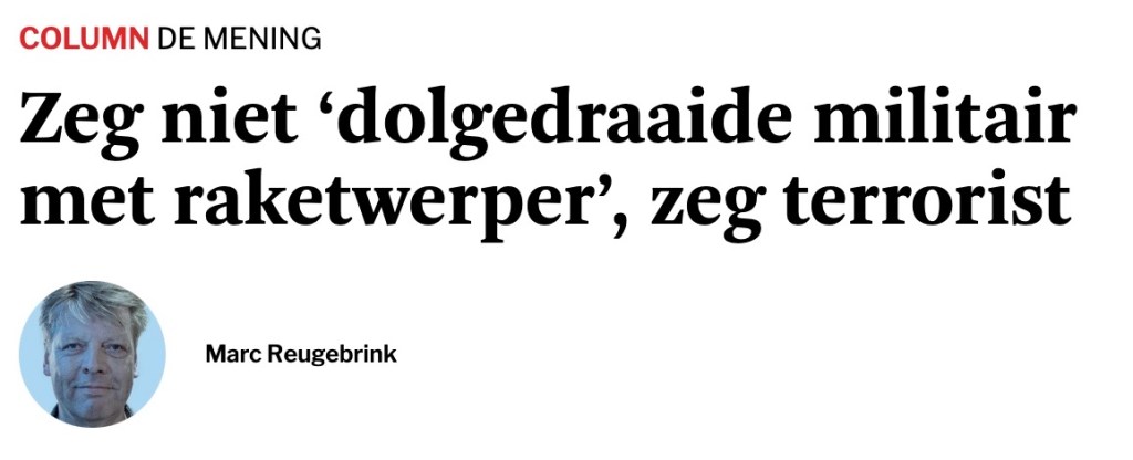 Zullen we Jürgen C., de ‘dolgedraaide militair met raketwerper’, zoals deze krant kopte, nu eindelijk eens gewoon een terrorist noemen? Was Jürgen C. niet de bleekscheet die hij is, was hij niet extreemrechts, maar extreemlinks geweest – ik wed dat hij allang als terrorist geïdentificeerd zou zijn. Ik heb er geen studie naar verricht, maar het volstaat om het nieuws te volgen: een terrorist is moslim (nooit christen), heeft een afwijkend kleurtje (is niet bleek en roze), of wil met geweld de gevestigde orde omverwerpen. Een witte man met raketwerpers die met geweld een orde wil vestigen, is alleen maar dolgedraaid (als Anders Breivik of Brenton Tarrant, neem ik aan).
