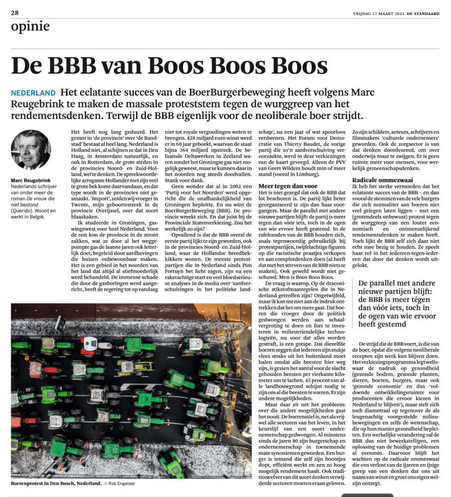 De strijd die de BBB voert, is die voor het behoud van de boer die volgens neoliberale recepten zijn werk kan blijven doen. Het verkiezingsprogramma legt weliswaar de nadruk op gezondheid (gezonde bodem, gezonde planten, dieren, boeren, burgers, maar ook ‘gezonde economie’ en dus ‘voldoende ontwikkelingsruimte voor producenten die ervoor kiezen in Nederland te blijven’), maar stelt zich toch diametraal op tegenover de als leugenachtig voorgestelde milieubewegingen en zelfs de wetenschap, die op hun manier gezondheid bepleiten. Voor een werkelijke verandering zal de BBB dus niet zorgen; voor een oplossing van de huidige problemen al evenmin. Daarvoor blijft het wachten op de radicale ommezwaai die ons verlost van de ijzeren en ijzige greep van een denken dat ons uit naam van winst en groei ons eigen welzijn ontzegt.