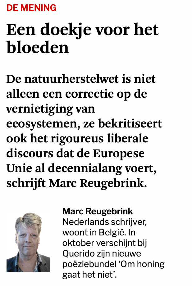 Het recht op een gezonde leefomgeving is nooit een prioriteit geweest voor Europa. Voor de winstgevendheid van industrie en landbouw mochten best wat mensen sterven. En dieren. Hele ecosystemen. Het heeft de natuurherstelwet noodzakelijk gemaakt. Maar als men niet beseft dat de wet eigenlijk pleit voor een drastische ideologische heroriëntering, voor een ander fundament voor Europa, zal zij een doekje voor het bloeden blijven.