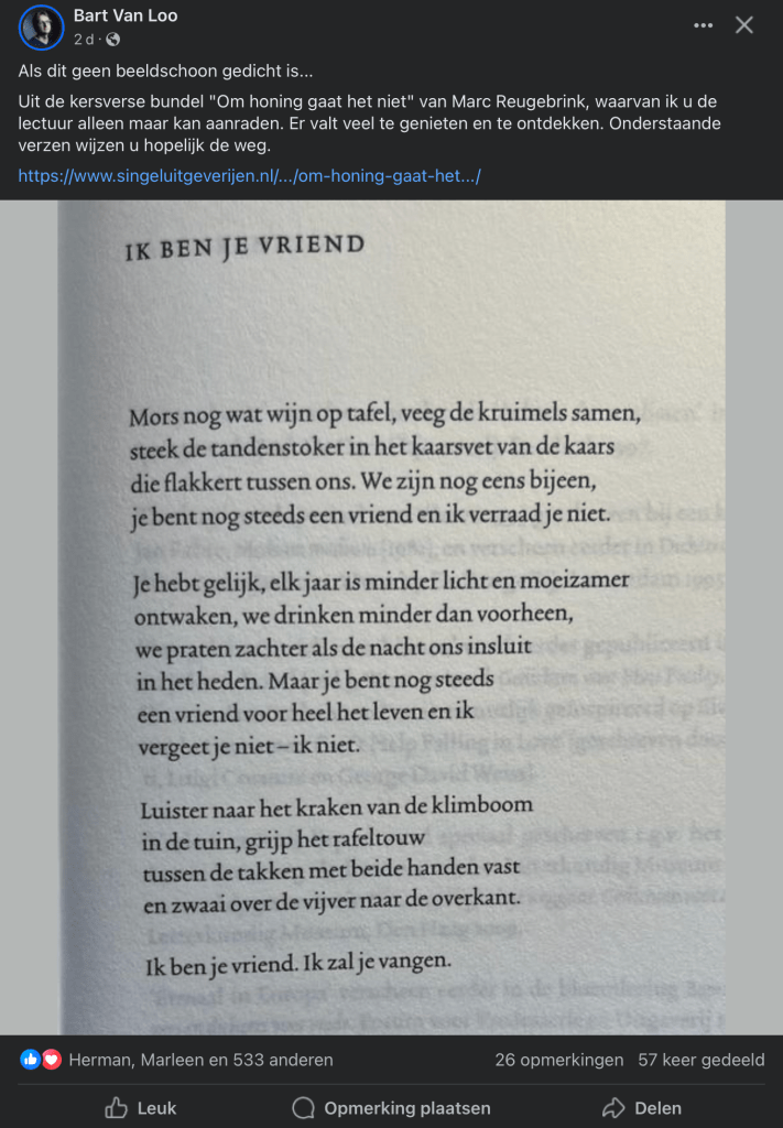 Maar daar gaat het de lezer niet om. Die herkent de vriend. Die herkent de vriendschap. De troost van de trouw in het licht van ons onvermijdelijk verscheiden. Die herkent wat het gedicht vooral ook uitdrukt: dat ook vriendschap uiteindelijk door verlies omgeven is, zoals liefde dat is. Wat wél irrelevant blijft, is de vraag om welke vriend het dan gaat. Daar past naar de lezer toe maar één antwoord op: om jouw vriend. Want zo is het geschreven, en moet literatuur ook altijd geschreven zijn wat mij betreft: dat de lezer zich verliest in iets van zichzelf.