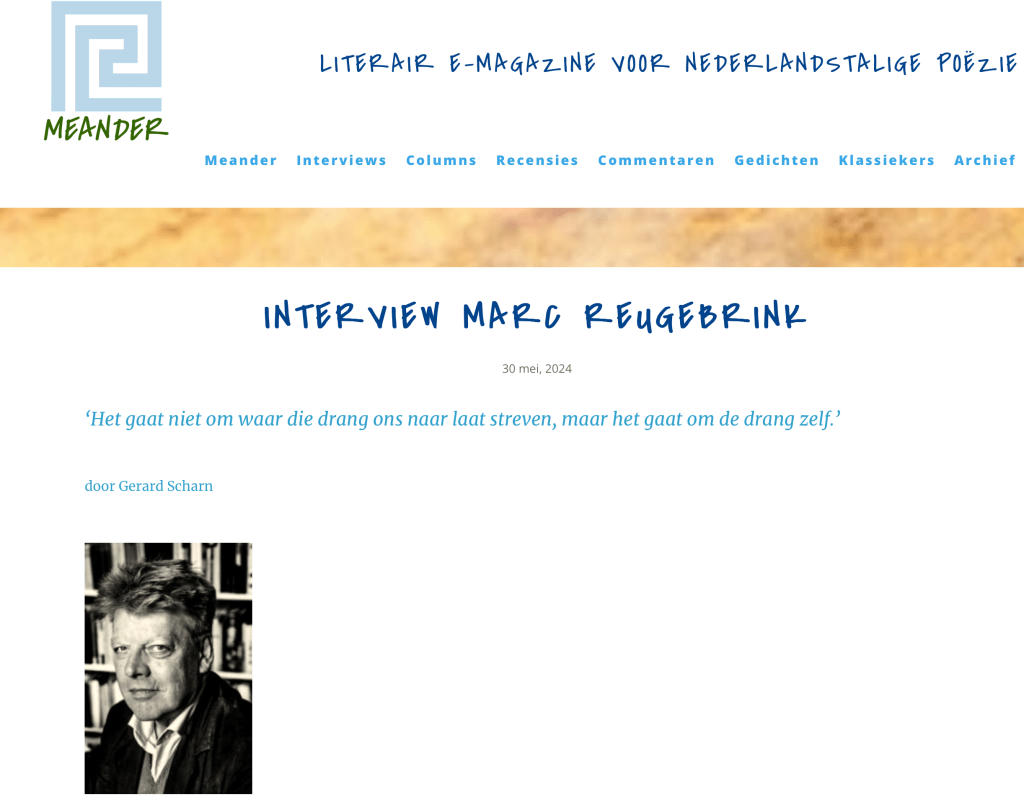 Ik was het al bijna weer vergeten, maar er werd mij een tijd terug een interview afgenomen door Gerard Scharn voor Meander. Het interview mét de bijbehorende gedichten (‘Ook dit wordt bos’, ‘Kale jonker’ en ‘In en uit de kudde’) is hier terug te vinden, maar ik heb de complete tekst hieronder nog eens gekopieerd.